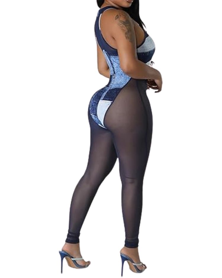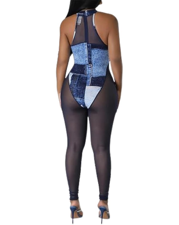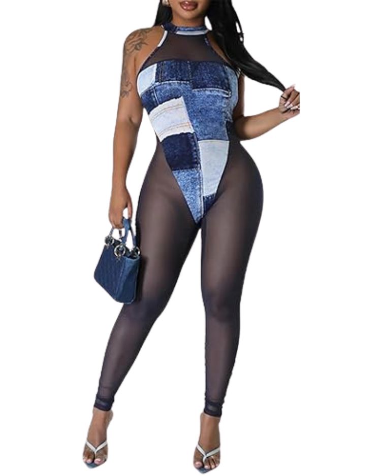 Women's Sexy Halter Colorblock Mesh Jumpsuit